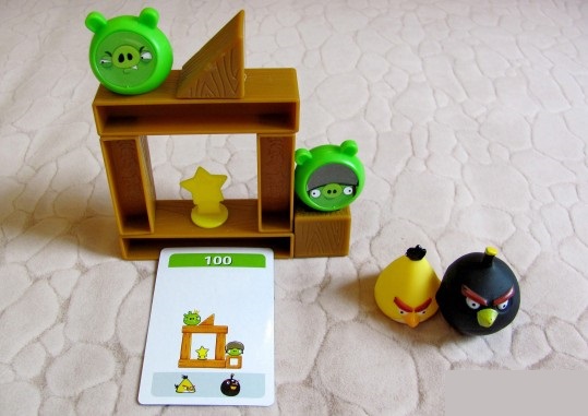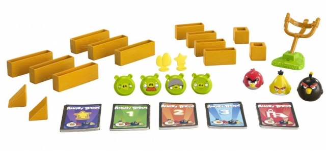 В коробке находятся рогатка, птицы, свиньи и пластиковые блоки, из которых нужно строить укрытия для свиней. Всё выдержано в стиле компьютерной версии игры. Блоки с фигурками довольно плотно сидят в органайзере, а вот рогатка откровенно болтается.
