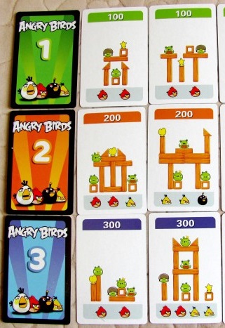 Карточки с заданиями разных типов сложности с указанием количества очков за успешное разрушение конструкции и "уничтожение" свиней.
