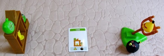 Теперь уже первый игрок берёт птичек, указанных на карте, и стреляет по "домику" свинок из катапульты.