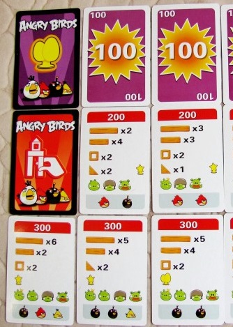 Первый игрок тянет одну карту из колоды "100", "200", "300" или с секретом. Цифры на рубашке – это количество победных очков, которые заработает игрок. На карте изображена постройка, которую необходимо разрушить, количество и цвет птиц, которые для этого используют.