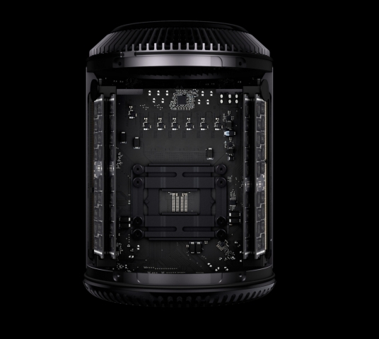 Стоит отметить, что сверхвысокая производительность требует соответствующего подхода к охлаждению, и Apple не обошла эту проблему стороной: сложная система маленьких кулеров и большой, центральный, расположенный на вершине цилиндрического корпуса, в сочетании с огромным легкосплавным центральным радиатором треугольного сечения с легкостью отводят любое количество тепла, которое способны выделить компоненты Mac Pro.