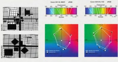 Между камерами зафиксированы значительные различия в цветопередаче. КМОП-технология хуже различает насыщенную желто-зеленую гамму. Но SX1 лучше воспроизводит оттенки красного, во всяком случае, она уверенно отличает алый цвет от красно-малинового. SX10 точно передает оранжевый и алый цвета и значительно лучше КМОП-версии — сине-зеленый.