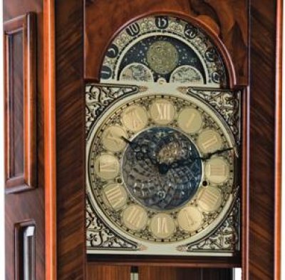 Циферблат с римскими цифрами из латуни прекрасно просматривается через хрусталь смотрового окошка. Очень гармонично сочетаются между собой лунный календарь, гири и маятник из того же металла.