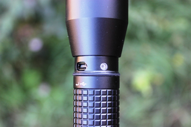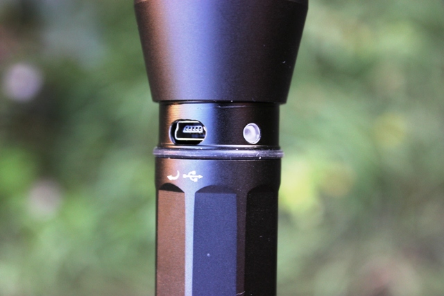 Вращая переднюю часть фонаря против часовой стрелки, мы обнаружим разъем USB-mini, а рядом с ним светодиодный индикатор зарядки. После зарядки фонаря, его переднюю часть необходимо вернуть в прежнее положение, что обеспечит должную герметизацию фонаря.