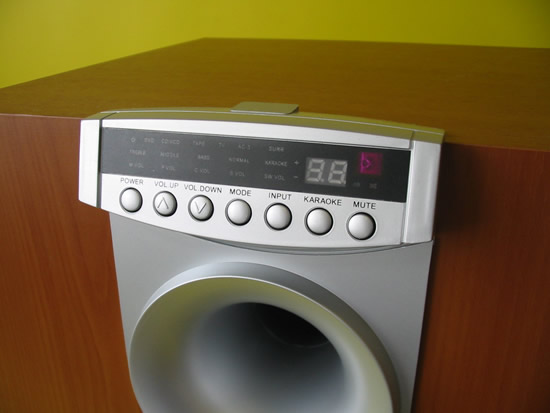 В его конструкции нет ничего особенного. Он имеет ИК индикатор и работает на расстоянии нескольких метров. Питание осуществляется с помощью батареек типа АА, которые устанавливаются в специальный отсек. Первое, что бросается в глаза, это большая красная кнопка "power" на верхней поверхности пульта. Она служит для включения и выключения стереосистемы. Ниже от нее расположены кнопки "vol-" и "vol+". С их помощью можно регулировать уровень громкости звукового сигнала. Кнопки "SPK" служат для выбора определенного канала, а "SPK-" и "SPK+" изменения громкости отдельных каналов. Если вы желаете повысить или понизить уровень определенных частот, следует кнопкой "EQ" выбрать определенный частотный диапазон и кнопками "EQ-" и "EQ+" регулировать его уровень. Кнопка "Mode" позволяет активировать определенный источник звука. Существует 3 варианта активности звуковых источников. "AC-3" – для использования режима 5.1. При этом активными являются все сателлиты и сабвуфер. Режимы "Normal" и "Surround" позволяют использовать источники звука, которые соединены со стереовходами. При включенном режиме "Normal" играть будут фронтальные сателлиты и сабвуфер. А в режиме "Surround" – фронтальные, тыловые и сабвуфер. C помощью кнопки "Input" можно переключаться между стереовходами (DVD, Tape, TV, CDVCD). Если вам необходимо отключить звук, то для этого вы можете использовать кнопку "Mute". Кнопка "Karaoke" отвечает за активность режима караоке.