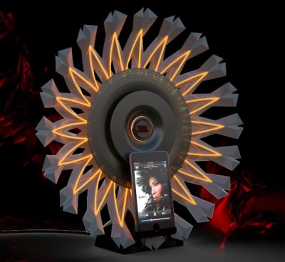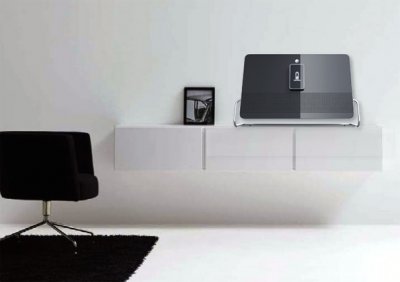 Беспроводная технология передачи данных по Wi-Fi, делают эту музыкальную систему уникальной в своём роде. Чёрный цвет и глянцевая поверхность красиво сочетается вместе с прекреплённым к музыкальной системе iPod. Ценители красоты не пройдут мимо такого элегантного дизайна, а заокругленые края смотрятся просто потрясающе. Конкурентам стоит задуматься над аналогичными предложениями. Так же, представленная система имеет дополнительный жесткий диск для хранения любимой музыки. Дизайнерская работа представлена Bluelarix Designworks.