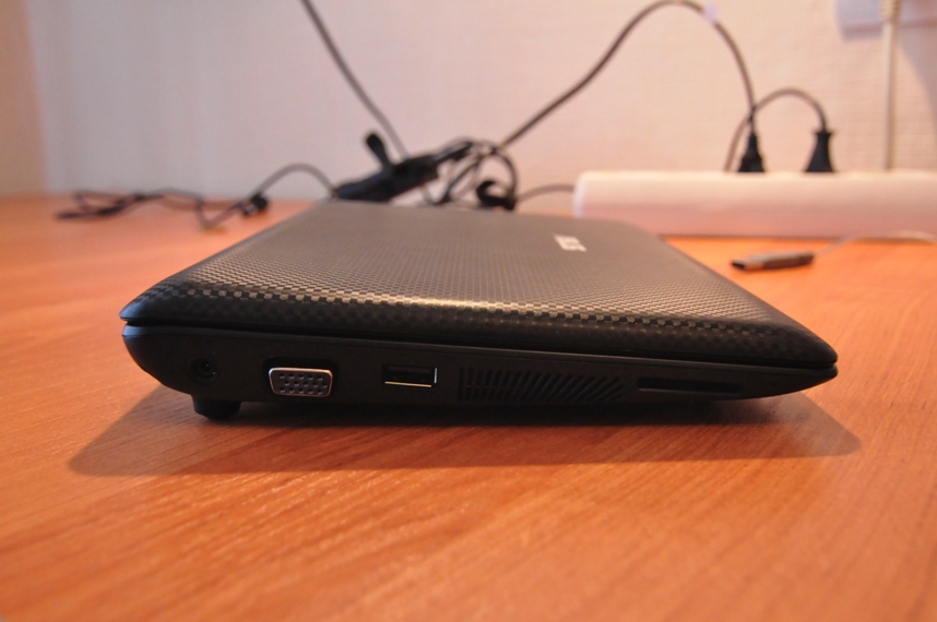 С левой стороны находятся разъем VGA для внешнего монитора, второй USB-порт, разъем для шнура питания, щель для SD-карт и вентиляционные отверстия: