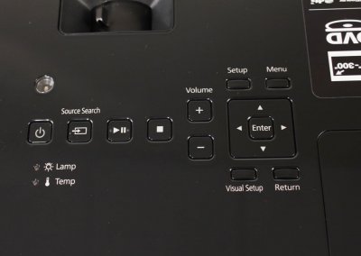 Згори знаходиться панель, що управляє, складається з 11 кнопок (у тому числі п'ятипозиційна навігаційна), колесо регулювання фокусу, важіль зрушення шторки, що прикриває об'єктив, два індикатори (температури і стани лампи), кришку лампового відсіку.