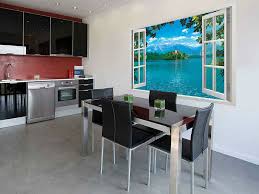 Для малогабаритной кухни используйте обои с видом из окна. Они визуально расширяют пространство. Для освещения фотообоев и стола используйте настенные светильники.