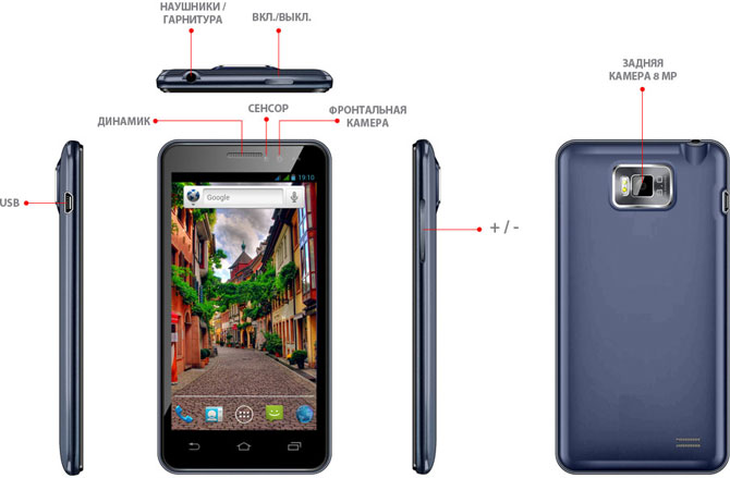 Значительную часть лицевой стороны смартфона, естественно, занимает 4.5-идюймовый экран. Над ним, по центру, расположена сетка, прикрывающая разговорный динамик, рядом – датчики освещения и приближенности, а также фронтальная вебкамера (2 МП).