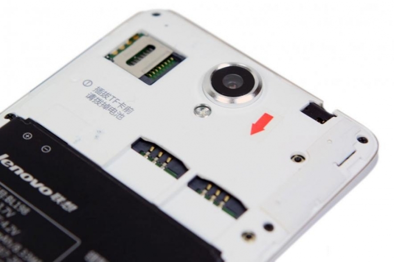 Крышка задней части устройства съемная, в пазах сидит довольно плотно – для ее снятия потребуется приложить усилия. Снимается вся тыловая панель. Под ней можно увидеть съемный аккумулятор, два слота для SIM-карт (правый слот – для работы в сетях 3G/2G, левый – только в 2G) и слот для карт памяти (microSD). SIM-карты можно достать или вставить только при извлеченной батарее. Слот для карты памяти реализован слегка необычно – для того, чтобы установить ее, нужно передвинуть металлический крепеж в сторону, а затем поднять его.
