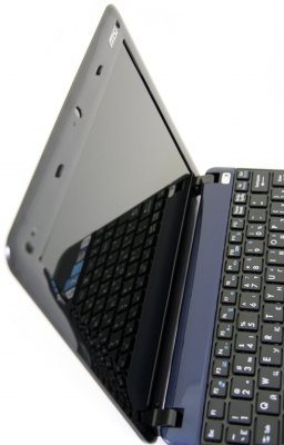 Кришка нетбука не має гострих кутів - всі кути корпусу згладжені і виглядають відмінно. На передній грані підстави, в правій частині, знаходяться світло діодні індикатори роботи вінчестера, батареї, адаптера бездротового зв'язку і т.д. Їхнє призначення можна дізнатися, тільки відкривши кришку - або вивчивши попередньо напам'ять.