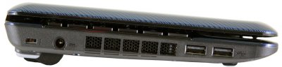 Зліва - порт безпеки Kensington, що дозволяє закріпити ноутбук на місці ключем або механічним кодовим пристроєм, прикріпленим до покритого гумою металевого троса, вхід для кабелю живлення, два порти USB 2.0. Більша ж частина цієї бічної панелі віддана під вентиляційні отвори.