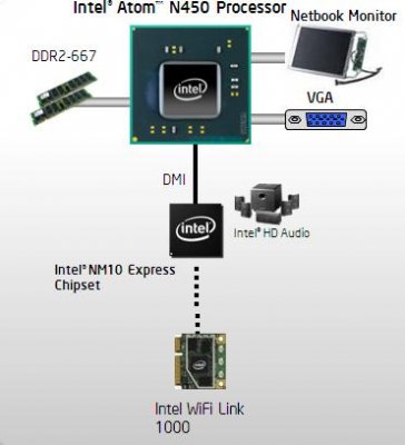 Новий чіпсет Intel NM10 Express у зв'язку з інтеграцією північного моста в процесор вийшов одно чіповим. Технічні можливості платформи включають підтримку 8 портів USB 2.0, двох PCI і чотирьох PCI Express x1, вбудований Ethernet-контролер і звуковий кодек Intel HAD, для нетбука цього цілком достатньо.