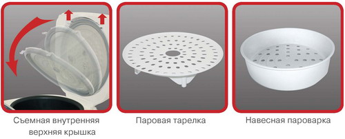 В комплект входит лопатка, ложка, мерный стакан, навесная пароварка и паровая тарелка. Производитель рекомендует в процессе приготовления пользоваться только этими предметами, потому как другие столовые приборы могут повредить антипригарное покрытие мультиварки.