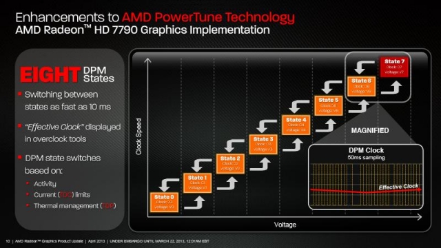 Данная технология впервые появилась на видеокарте Radeon HD 7790. Технология PowerTune работает следующим образом. От частоты 300 МГц включительно с шагом в 100 МГц отложены 8 значений. Для каждого из 8 значений частоты установлено свое значение напряжения питания. Частота, и соответственно напряжение питания графического ядра, изменяются в зависимости от текущей нагрузки на видеокарту. При этом логика отслеживает, чтобы видеокарта не выходила за рамки установленного уровня TDP. Значение частоты и напряжения питания изменяются с интервалом в 10 мс. В конечном итоге получаем усредненное значение частоты графического процессора. Новая линейка видеокарт получила более быструю и точную регулировку напряжения на процессоре, а также возможность получения реального значения тока и напряжения питания от аналоговых датчиков. Ранее AMD пренебрегала аналоговыми измерениями мощности в пользу эвристического предсказателя, но теперь они используются совместно. Также подвергся переработке алгоритм работы вентилятора системы охлаждения. Теперь он реагирует на повышение нагрузки на графический процессор. Благодаря чему скорость вращения начинает изменяться еще до получения сигнала о повышении температуры. Как следствие плавный и менее шумный разгон вентилятора. Правда, сначала обновленную технологию PowerTune получат три видеокарты: R7 260X, R9 290 и R9 290X.
