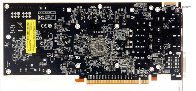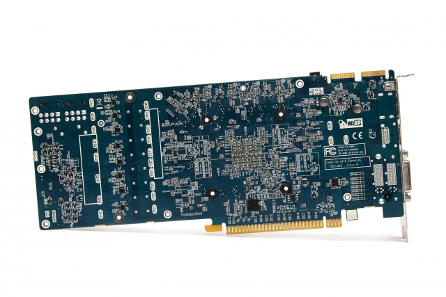 Она предотвращает изгиб печатной платы и выступает в качестве радиатора для драйверов системы питания. Видеокарта имеет габаритные размеры 280 мм x 120 мм. По высоте видеокарта занимает немного больше двух слотов расширения. Набор и расположение видеоинтерфейсов как у двух других видеокарт из тестирования.
