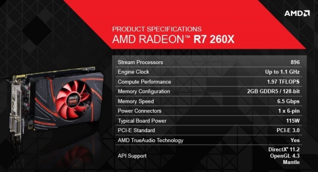 Видеокарта Radeon R7 260X оказалась не чем иным, как перемаркированной Radeon HD 7790. Она оснащается графическим процессором с 896 потоковыми процессорами, 56 текстурными блоками и 16 ROP. Ширина шины памяти осталась прежней и составляет 128 бит. Номинальная частота работы графического процессора и видеопамяти были повышены до 1100 МГц и 6500 МГц соответственно. Видеокарта получила поддержку технологии TrueAudio и обновленную технологию PowerTune. Номинальный объем видеопамяти возрос до 2 Гб. Вместе с увеличенными частотами увеличился и уровень TDP. Теперь он составляет 115 Вт против 85 Вт у HD 7790.