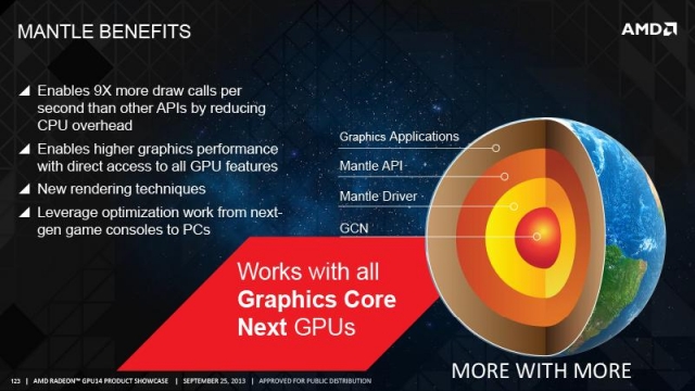 Помимо новых технологий был представлен низкоуровневый API – Mantle, реализованный в видеокартах новой линейки. Данный API позволяет разработчикам игровых приложений практически напрямую взаимодействовать с графическим процессором. Помимо увеличения быстродействия видеокарт от AMD он также должен облегчить портацию игр с консолей на компьютеры. Учитывая тот факт, что в популярных современных консолях (Wii U, PlayStation 4 и Xbox One) используются графические процессоры от AMD можно предположить, что в будущем видеокарты AMD будут иметь преимущество над видеокартами Nvidia в большинстве современных игр. Первой игрой с поддержкой нового API станет Battlefield 4. Для нее в декабре будет выпущен специальный патч с поддержкой API Mantle. Вот тогда можно будет реально оценить быстродействие видеокарт от AMD и Nvidia в современных играх.