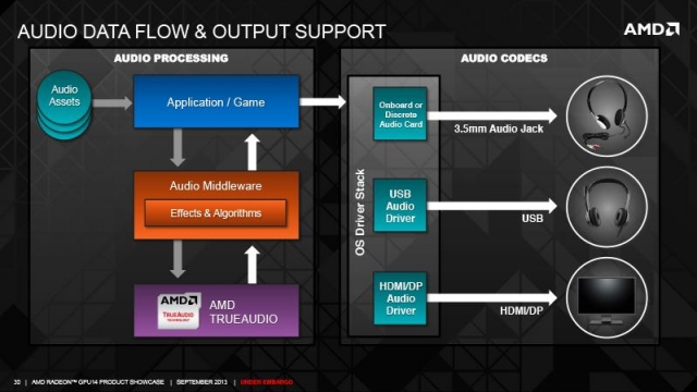 Для создания различных звуковых эффектов TrueAudio предоставляет разработчикам доступ не только к лицензированной middleware-библиотеки, но и к базовым функциям звукового процессора. Это позволит им создавать любые звуковые эффекты. Если учесть тот факт, что на консолях есть поддержка аппаратных DSP, то TrueAudio должна упростить портирование игр на компьютеры.