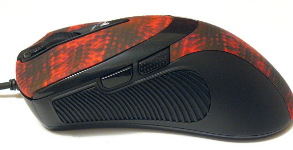 Мышка оснащена шестью кнопками и колесом прокрутки, которое здесь также выступает в качестве дополнительной кнопки, задействовать которую можно нажатием на скролл вниз. Скролл не имеет функции наклона вбок. К работе колеса прокрутки нет никаких претензий, ход скролла легкий, но четкий и плавный. По словам производителя главным преимуществом мышки является кнопка 3xFire, которая позволяет совершать три «выстрела» за минимальный промежуток времени.