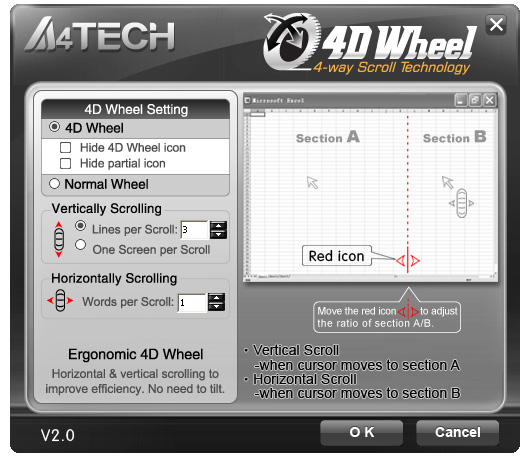 Еще одной интересной опцией является поддержка двух дополнительных «направлений», которыми можно управлять при помощи скролла. Когда курсор находится на левой части специально поделенного экрана, реакция на вращение колеса прокрутки стандартная - вверх или вниз. Однако когда Вы переместите мышь на другую сторону экрана, вращение скролла приведет к тому, что изображение на экране монитора будет перемещаться в горизонтальной плоскости. Это очень удобное решение для работы с электронными таблицами или графическими изображениями, которые имеют большое разрешение. В этом окне мы также можем изменить настройки в соответствии с нашими предпочтениями, включая возможность полного отключения опции 4D Wheel.