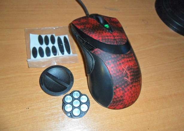В глаза также бросается большого размера крышка, за которой находится «магазин», предназначенный для установки в нем специальных грузиков. Чтобы снять крышку, нужно повернуть ее против часовой стрелки. В образовавшееся отверстие можно вложить до семи грузиков, общий вес которых составляет 18,5 грамма. «Магазин», в который вставляются металлические грузики, весит 1,5 грамма, что в сумме дает нам возможность утяжелить мышку на 20 грамм.