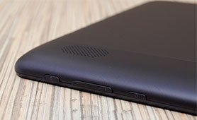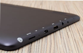 На верхней боковой грани находятся кнопка регулировки питания, клавиши управления громкостью и кнопка “Домой”. Элементы управления расположены слева. К ним относятся: разъем для сетевого адаптера, Mini Jack 3.5 мм, miniHDMI аудиовыход, microUSB, микрофон, слот для карты памяти microSD (до 32 Gb).