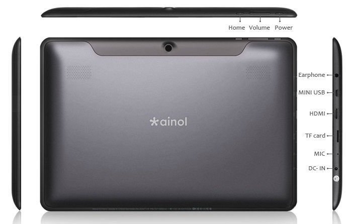 Внешний вид планшета поражает своей изысканностью. Планшет обладает приятными тактильными свойствами, радует глаз удачным расположением физических кнопок с подписями. Ainol Novo 10 Captain имеет две камеры: фронтальная и тыловая, с разрешением матрицы 0,3 и 2 мегапикселя соответственно, а также стильный двойной динамик.