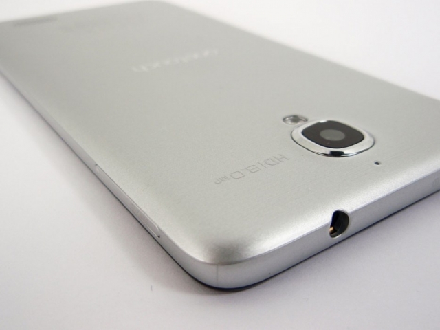 Задняя часть смартфона смотрится элегантно. Поверхность этой панели напоминает текстурированный алюминий, хотя на самом деле это всего лишь пластик. Здесь находятся объектив камеры, вспышка и прорезь мультимедийного динамика. Объектив камеры заметно выпирает, из-за чего рискует поцарапаться. Остается только догадываться, каким стеклом он защищен.