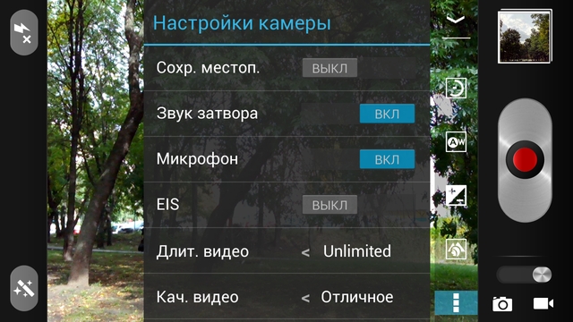 В настройках камеры можно выбрать баланс белого (лампа дневного света, дневной свет, пасмурно, лампа накаливания, сумерки), значение светочувствительности, активировать звук затвора, таймер, выбрать длительность и качество видеозаписи, размер фотографии, режим съёмки (ночь, пейзаж, портрет, закат, ночь, группа).