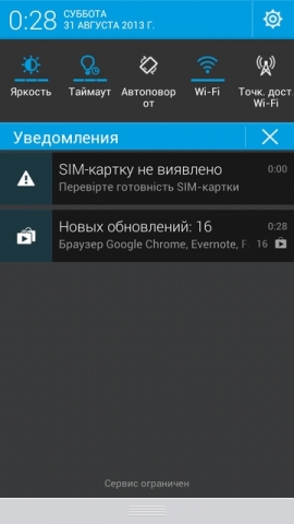 Шторка панели уведомлений выдвигается из строки состояния, на которой отображаются индикатор уровня заряда батареи, время, значки уведомлений, иконки активных беспроводных модулей и выбранного звукового профиля, уровень приёма сигнала мобильной сети.