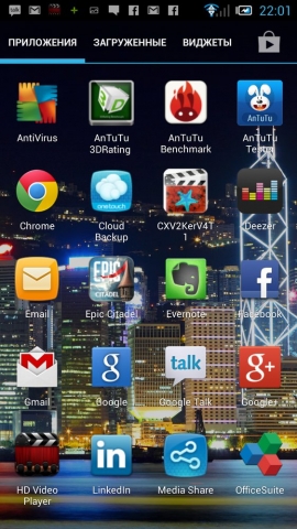 Пользователю аппарата доступно 5 рабочих столов, на которых размещаются иконки приложений, виджеты и папки. Изменять количество окон нельзя. На рабочем столе может размещаться максимально 4 ярлыка по горизонтали и 4 ярлыка по вертикали. На рабочем столе также располагаются поисковая строка Google и четыре закреплённых иконки для открытия телефонной книги, сообщений, браузера и номеронабирателя. Папки можно создавать перетаскиванием одной иконки программы или игры на другую. В нижней части дисплея по центру располагается иконка входа в главное меню, которое представляет собой матрицу ярлыков приложений 5х4. В верхней части меню имеются три вкладки («Приложения», «Загруженные», «Виджеты») и иконка входа в магазин Google Play.