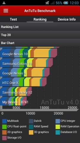 В синтетическом тесте производительности AnTutu смартфон выдаёт скромный 8741 балл. Схожий уровень производительности демонстрируют флагманы двухлетней давности.