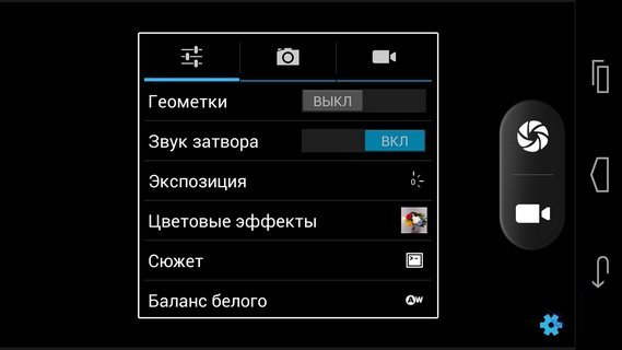 В настройках камеры можно выбрать сюжет съёмки, размер фотографий, баланс белого, активировать геометки, функцию распознавания лица, звук спуска затвора, задержку съёмки, применить цветовые эффекты, изменить значение экспозиции, установить таймер и тому подобное. Кроме обычных фотографий, камера может делать серии кадров по 40 или 99 фотографий.
