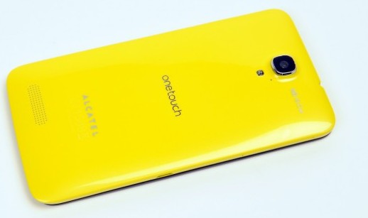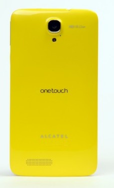 В верхней части задней панели аппарата расположены отверстие микрофона, фотовспышка, объектив камеры и надпись, информирующая о возможностях камеры. Посередине панели находится надпись «onetouch», немного ниже расположен логотип компании, а в самом низу – множество отверстий динамика. Глазок камеры выступает из корпуса миллиметра на полтора, поэтому он может быстро поцарапаться.