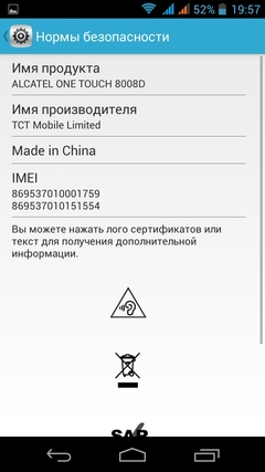 Узнать наименование и страну производителя смартфона, а также индекс модели и IMIE, можно в пункте меню «Нормы безопасности».
