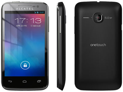 На передней стороне находится 4-дюймовый экран. Под экраном есть три сенсорные клавиши: назад, на главную и меню. Над дисплеем размещены узкая прорезь под слуховой динамик и фронтальная камера. Чуть ниже – надпись «ALCATEL».