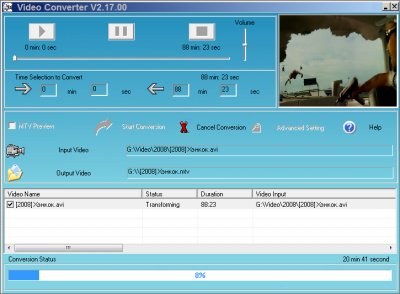 Для просмотра видео, с помощью плеера, его предварительно следует переконвертировать в формат MTV. Для этого на диске имеется программа Video Convert, которая устанавливается на компьютер, причем довольно быстро. Процесс конвертации тоже весьма быстрый, на современных компьютерах в среднем он занимает столько же времени, как и просмотр самого фильма.