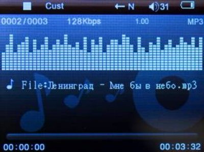 При воспроизведении на экране отображается спект анализатор (как замена визуальным эффектам), название композиции, значки режима эквалайзера и воспроизведения. Также имеется иконка заряда аккумулятора, время композиции общее и проигранное, битрейд песни, формат и т.д.