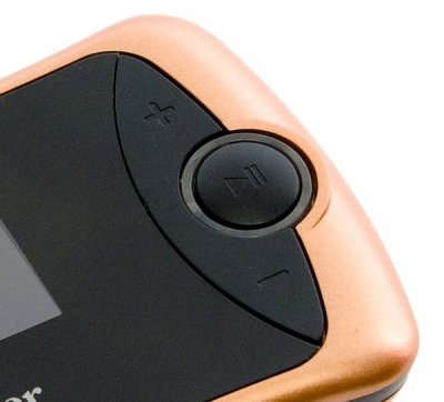 Рядом с дисплеем расположена большая круглая клавиша воспроизведения/паузы с синей подсветкой. При длительном нажатии она включается или выключает плеер. Сверху и снизу от этой клавиши находятся кнопки регулировки громкости. Еще они используются для перемещения по меню.