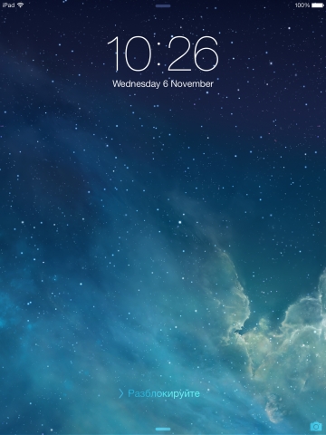 На экране блокировки устройства отображается вся важная информация. В самом верху экрана можно увидеть строку состояния. На ней отображаются уровень заряда батареи, надпись «iPad», значки активных беспроводных модулей. Немного ниже строки состояния можно увидеть крупные цифры часов, под которыми более мелким шрифтом указываются день недели и дата. В нижнем правом углу дисплея находится значок камеры, нажав на который можно быстро её запустить.