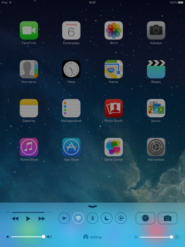 Из нижней части экрана планшета выдвигается панель центра управления, на которой имеются ползунки регулировки звука и яркости экрана, иконки активации/деактивации беспроводных модулей (Wi-Fi и Bluetooth), режимов «в самолёте» и «не беспокоить», автоповорота ориентации дисплея. Тут же находятся значки AirDrop и AirPlay, а также иконки 4 приложений (калькулятор, камера, фонарик и будильник).