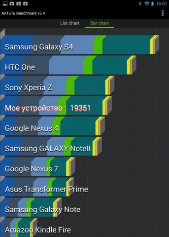 В синтетическом тесте AnTuTu планшет демонстрирует неплохой результат и набирает около 19000 баллов. В рейтинге бенчмарка аппарат занимает место рядом со смартфоном LG Google Nexus 4, который имеет аналогичную новинке аппаратную «начинку».