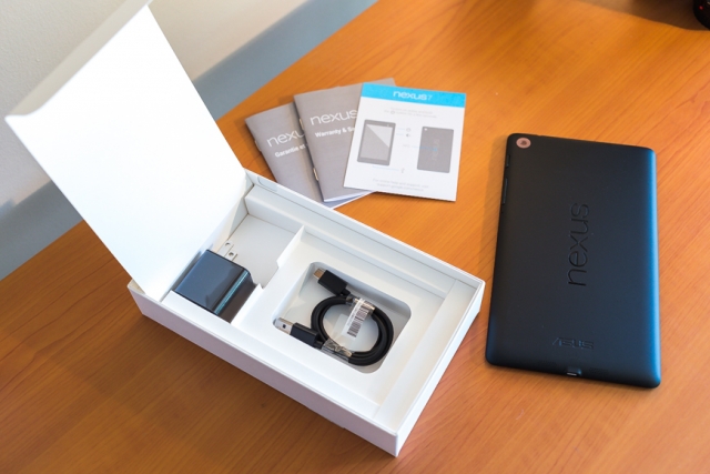 Asus Google Nexus 7 (2013) продаётся в картонной коробке синего цвета. На коробке имеются логотипы двух компаний-производителей, а также изображение приобретаемого устройства. Внутри коробка имеет белый цвет, а не чёрный, как у предшественника. Комплектация планшета достаточно скудная и включает в себя лишь гарантийный талон, краткую инструкцию по эксплуатации, кабель USB и зарядное устройство (1,35 ампера, 5,2 ватта).