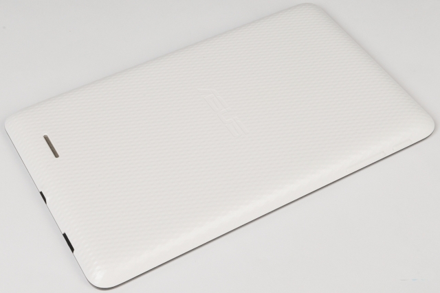 «Спинка» аппарата приятная на ощупь, она выполнена из текстурированного пластика. Дисплей устройства окаймляет чёрная пластиковая рамка. Она достаточно широкая, поэтому устройство удобно держать как в горизонтальной, так и в вертикальной ориентации так, чтобы не касаться пальцами экрана.