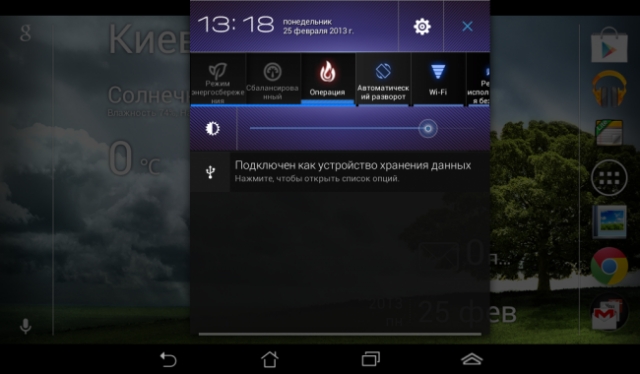 Датчика освещённости планшет не имеет, поэтому регулировать уровень яркости дисплея можно только вручную.