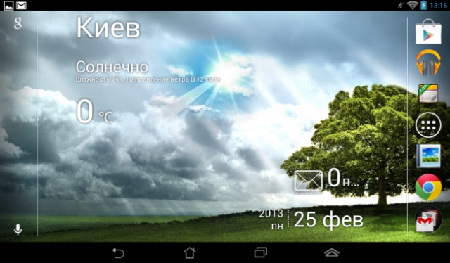 На планшете имеется установленный набор фирменных виджетов - Asus Battery (демонстрирует уровень оставшегося заряда аккумулятора), Asus E-mail (показывает количество непрочитанных электронных писем), Asus Task Manager (позволяет закрывать ненужные фоновые приложения), Asus time, ASUS Weather (демонстрирует погоду) и другие.