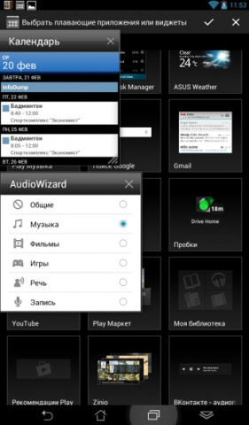 В нижней части экрана располагается панель с четырьмя виртуальными кнопками управления, три из которых являются стандартными для Android – «Назад», «Домой» и «Диспетчер запущенных приложений». Четвёртую кнопку уже добавили разработчики планшета. Эта кнопка предоставляет быстрый доступ к специальным виджетам, которые открываются поверх всех приложений. В список доступных виджетов пользователь может добавлять новые. Изначально там находятся калькулятор, секундомер, AudioWizard, календарь, почтовый клиент и браузер. Окошки с виджетами открываются не на весь экран. Этим они и отличаются от самих приложений. Одновременно можно запускать до 6 виджетов. Из любого виджета можно быстро перейти к самому приложению.