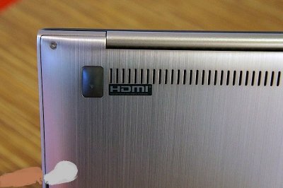 Все порты размещены на торцах корпуса: справа находятся интерфейсы miniVGA и miniHDMI, один порт USB 3.0 и гнездо для подключения зарядного устройства, а слева расположен еще один разъем USB 3.0, аудиовыход (диаметром 3,5 мм) и слот для карт памяти формата SD. По центру (над экраном) расположена 1,3-мегапиксельная веб-камера, с парой микрофонов для видеозвонков в Skype или же других сервисах.